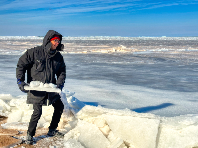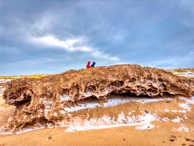 It’s no secret that the ocean is our happy place. It is why we decided to make Nova Scotia our home base. We love it best in the summer but genuinely love our winter explorations on ice on Nova Scotia’s north shore. We love walking on water, water that is frozen solid. We marvel at the frozen-in-place waves and ripples, the windswept patterns of sand and snow. We love the winter quiet of the ocean and the subtle shifts and sounds during a melt. The north shore beaches are places of wonder on any given day, more so in the winter.